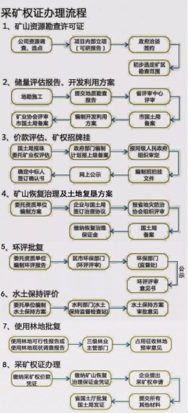 采礦權證辦理流程見下圖,要按照流程做各項技術方案和審批,各方案又是一環套一環,地質儲量報告做完才能做開發利用方案,開發利用方案評審備案后,才能進行價款評估,然后才上網掛牌出讓,在這之前,采礦權人都是不確定的。通過網上招拍掛的手續,拍得礦權后,拍得人交完礦權價款后,才基本確定礦權人,但在沒有頒發采礦權證之前,還都不能開展采礦活動。完成招拍掛手續后,還需要辦理恢復治理和土地復墾方案、環評報告、水土保持方案等技術方案,還要繳納恢復治理基金等等手續,才能拿到紅本本。這些程序歷時短則兩三年,長則四五年,需要付出艱苦而繁重的工作。